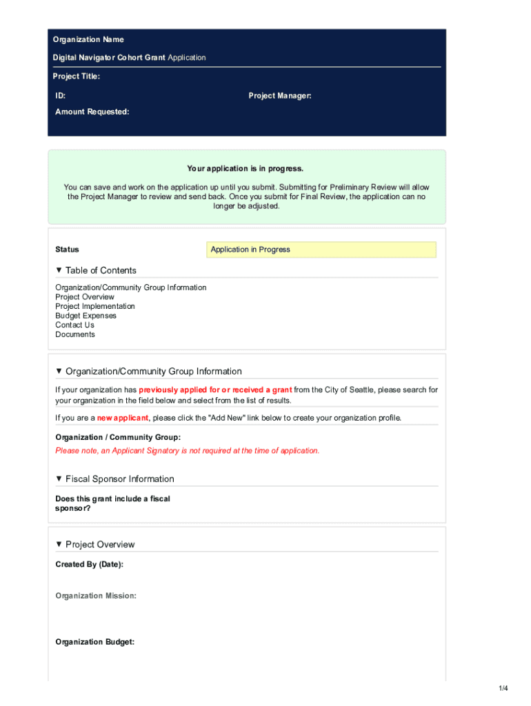 Organization Name Digital Navigator Cohort Grant Application Project Title: ID:Project Manager:Amount Requested:Your application is in progress. You can save and work on the application up until you