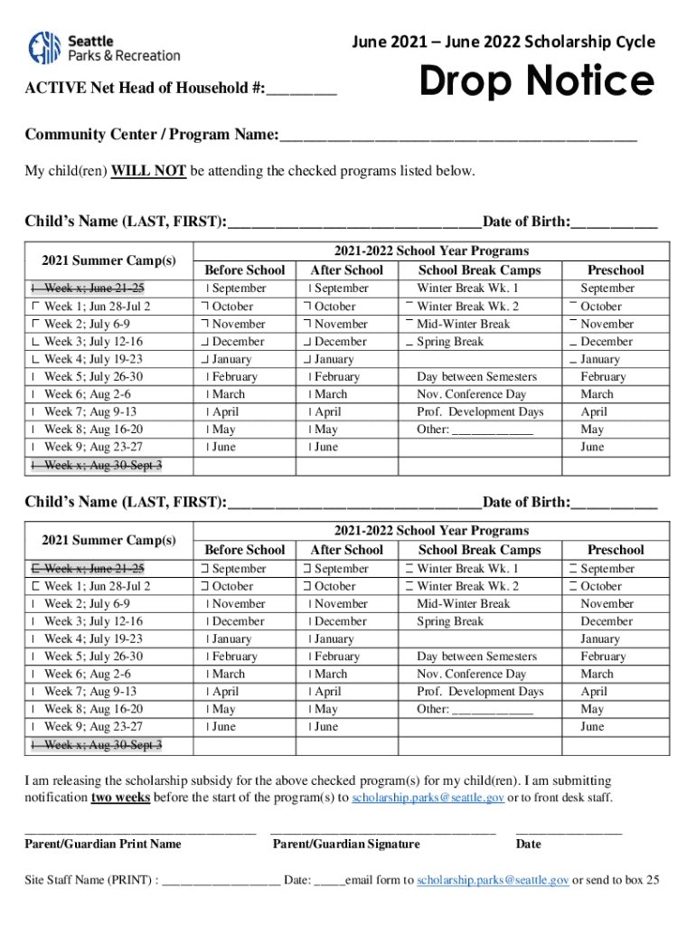 June 2021 June 2022 Scholarship Cycle ACTIVE Net Head of Household #:___Drop NoticeCommunity Center / Program Name:___ My child(men) WILL NOT be attending the checked programs listed below. Child's