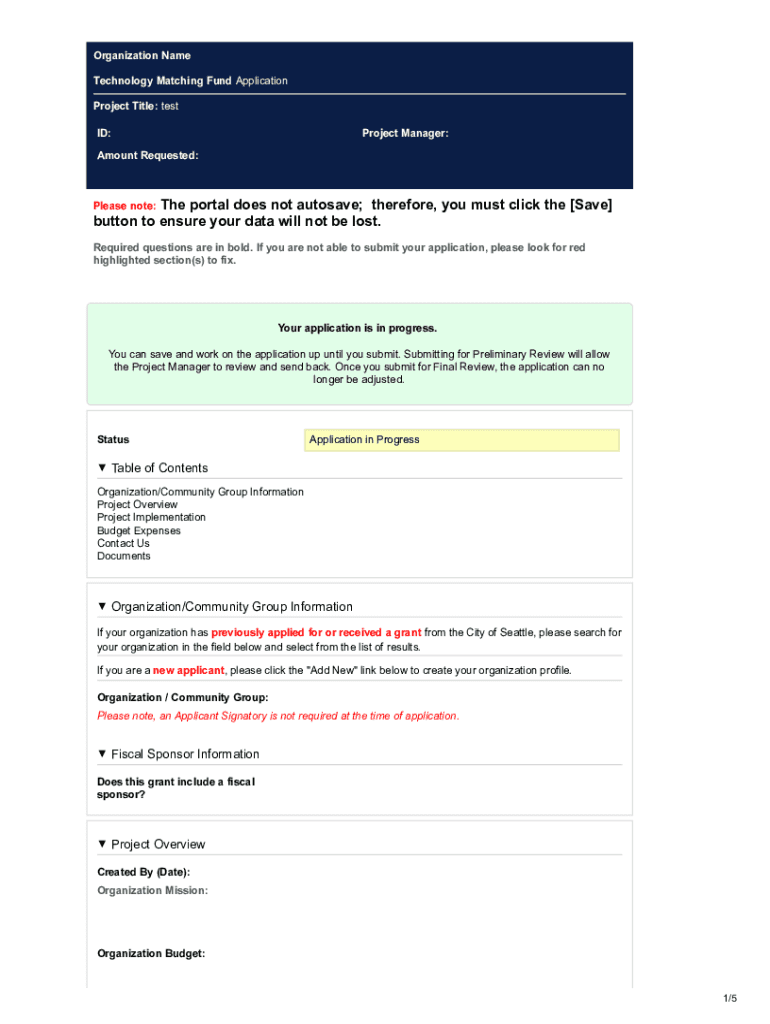 Organization Name Technology Matching Fund Application Project Title: test ID:Project Manager:Amount Requested:The portal does not autosave; therefore, you must click the [Save] button to ensure your