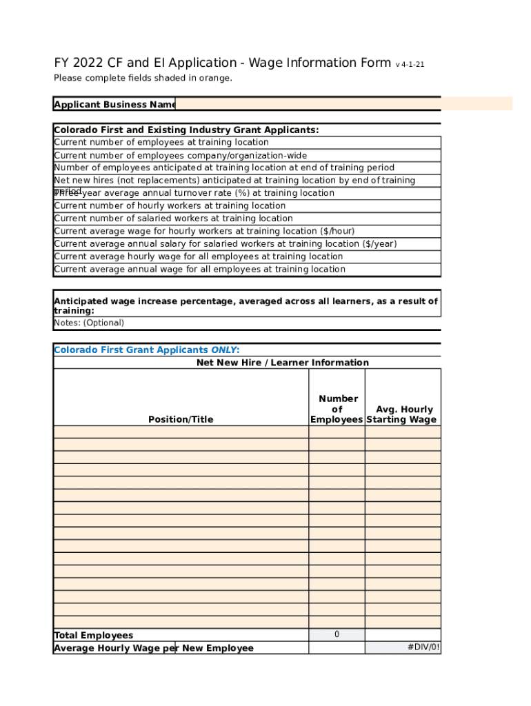 FY 2022 CF and EI Application Wage Information Form 4121Please complete fields shaded in orange. Applicant Business Name: Colorado First and Existing Industry Grant Applicants: Current number of employees