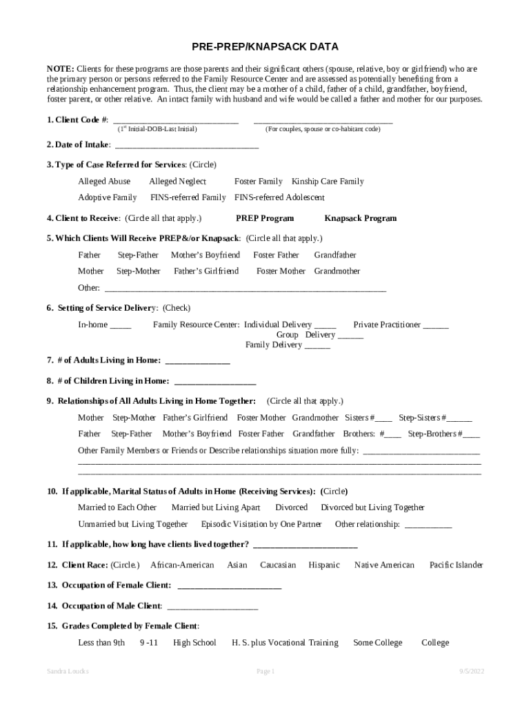 What is PRE-PREP/KNAPSACK DATA - Southeastern Louisiana University Form?