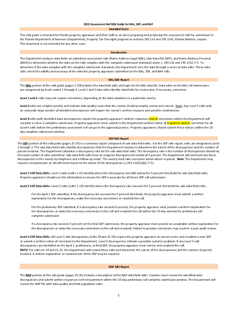 2022 Assessment Roll Edit Guide for NAL, SDF, and NAP Intended Users This edit guide is intended for Florida property appraisers and their staff as an aid in preparing and producing the assessment