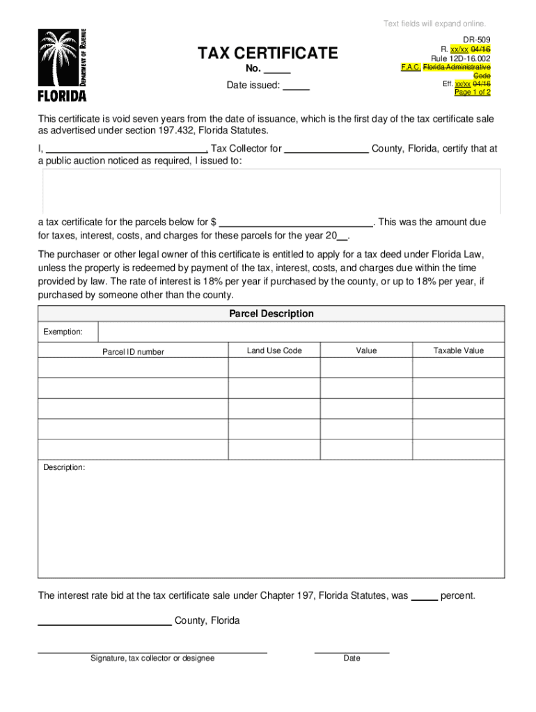 Text fields will expand online. DR509 R. xx/xx 04/16 Rule 12D16.002TAX CERTIFICATE. A.C. Florida Administrative Code Eff. Xx/xx 04/16-Page 1 of 2No. Date issued:This certificate is void seven years