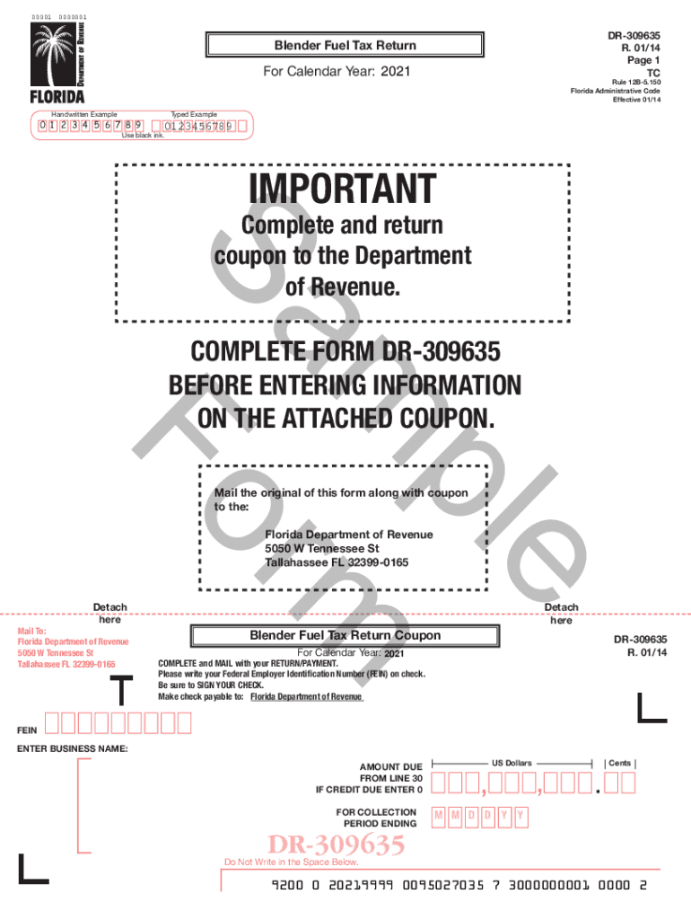 00001 0000001DR309635 R. 01/14-Page 1 Blender Fuel Tax Returner Calendar Year: 2021Rule 12B5.150 Florida Administrative Code Effective 01/14 Handwritten Example0 1 2 3 4 5 6 7 8 9Typed Example0123456789Use