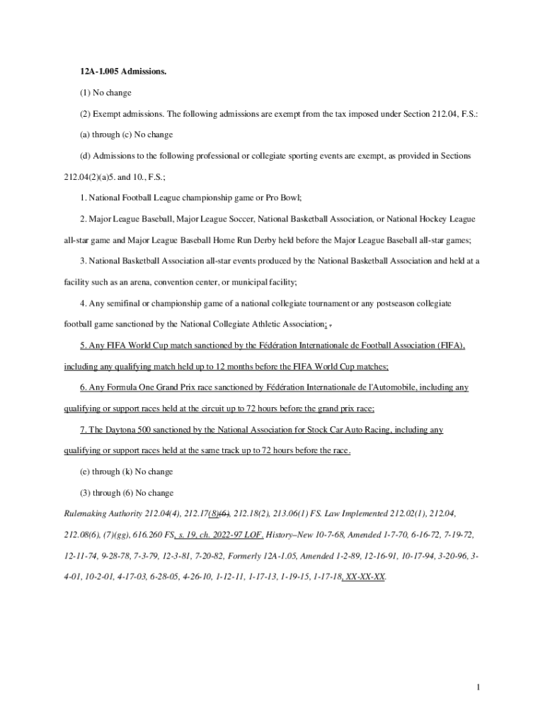 12A1.005 Admissions. (1) No change (2) Exempt admissions. The following admissions are exempt from the tax imposed under Section 212.04, F.S.: (a) through © No change (d) Admissions to the following