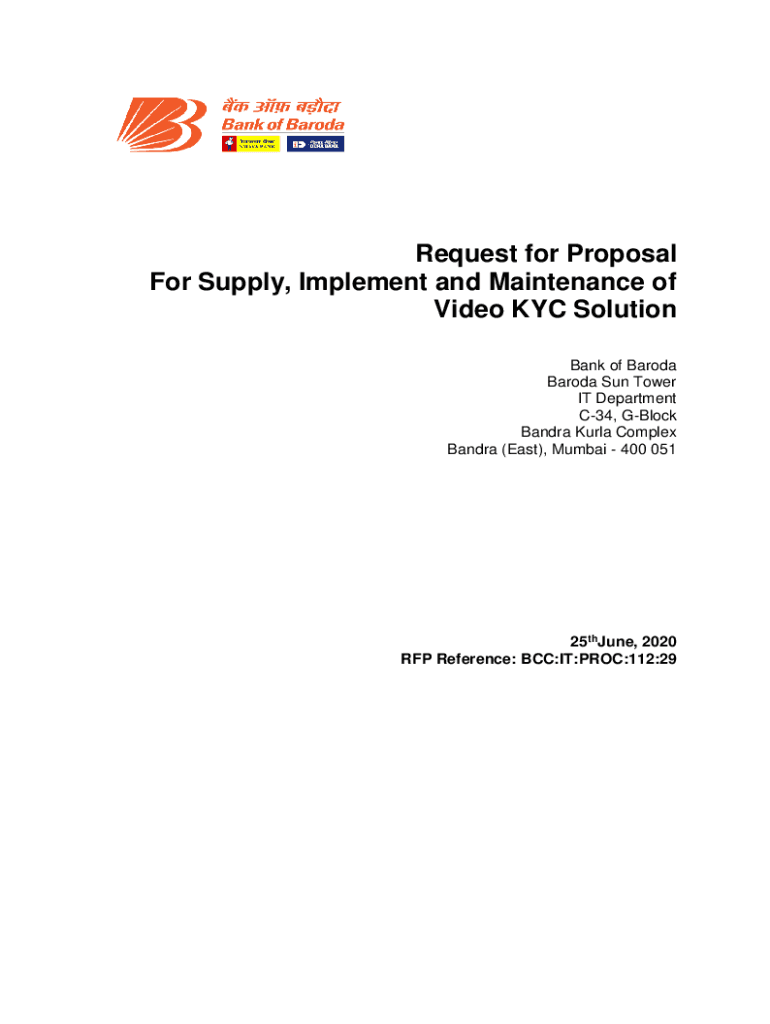 Request for Proposal For Supply, Implement and Maintenance of Video KYC Solution Bank of Baroda Sun Tower IT Department C34, Block Sandra Karla Complex Sandra (East), Mumbai 400 05125thJune, 2020