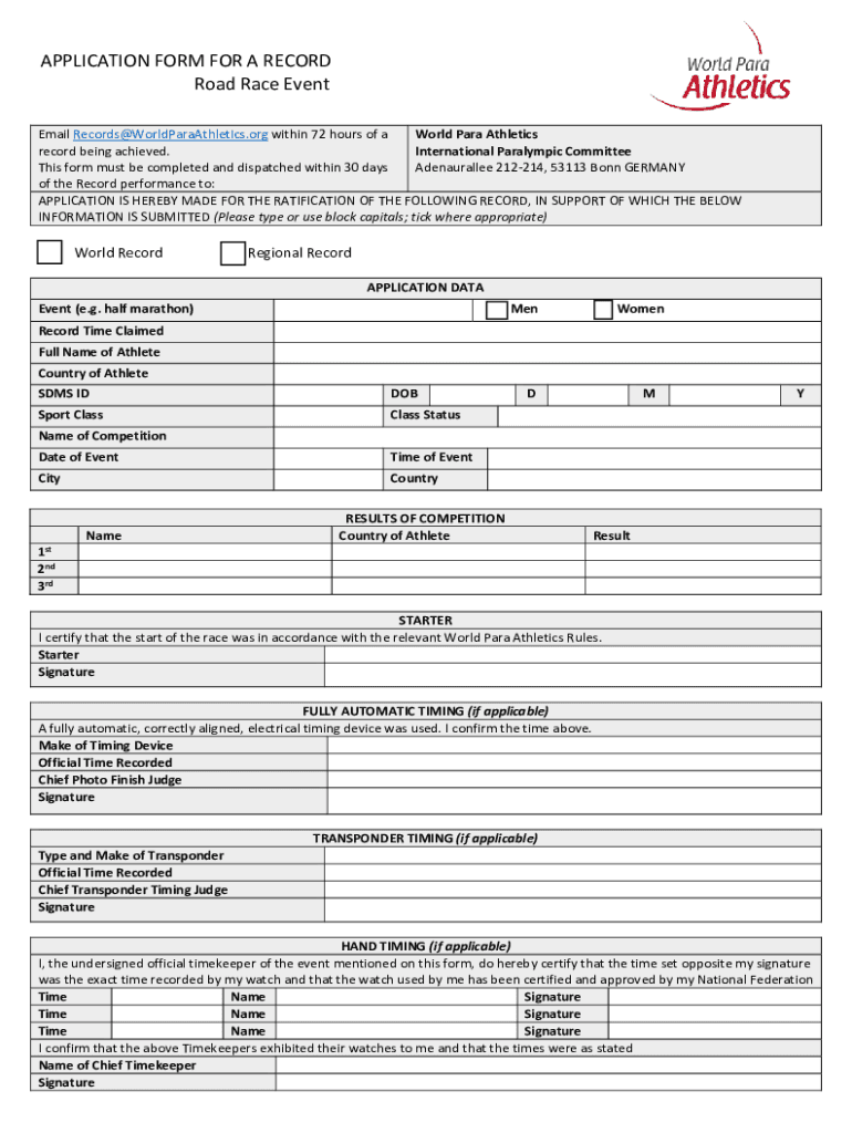 Get the free APPLICATION FORM FOR A RECORD Road Race Event