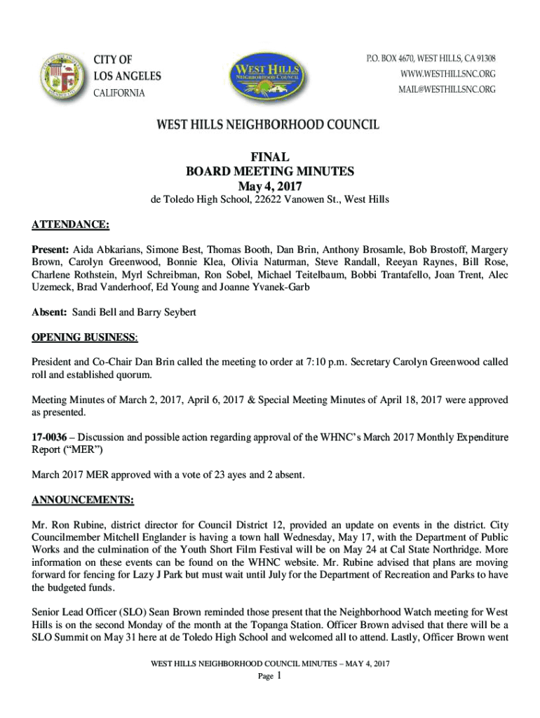 FINAL BOARD MEETING MINUTES May 4, 2017, de Toledo High School, 22622 Known St., West Hills ATTENDANCE: Present: Aida Agrarians, Simone Best, Thomas Booth, Dan Brain, Anthony Browsable, Bob Bros toff,