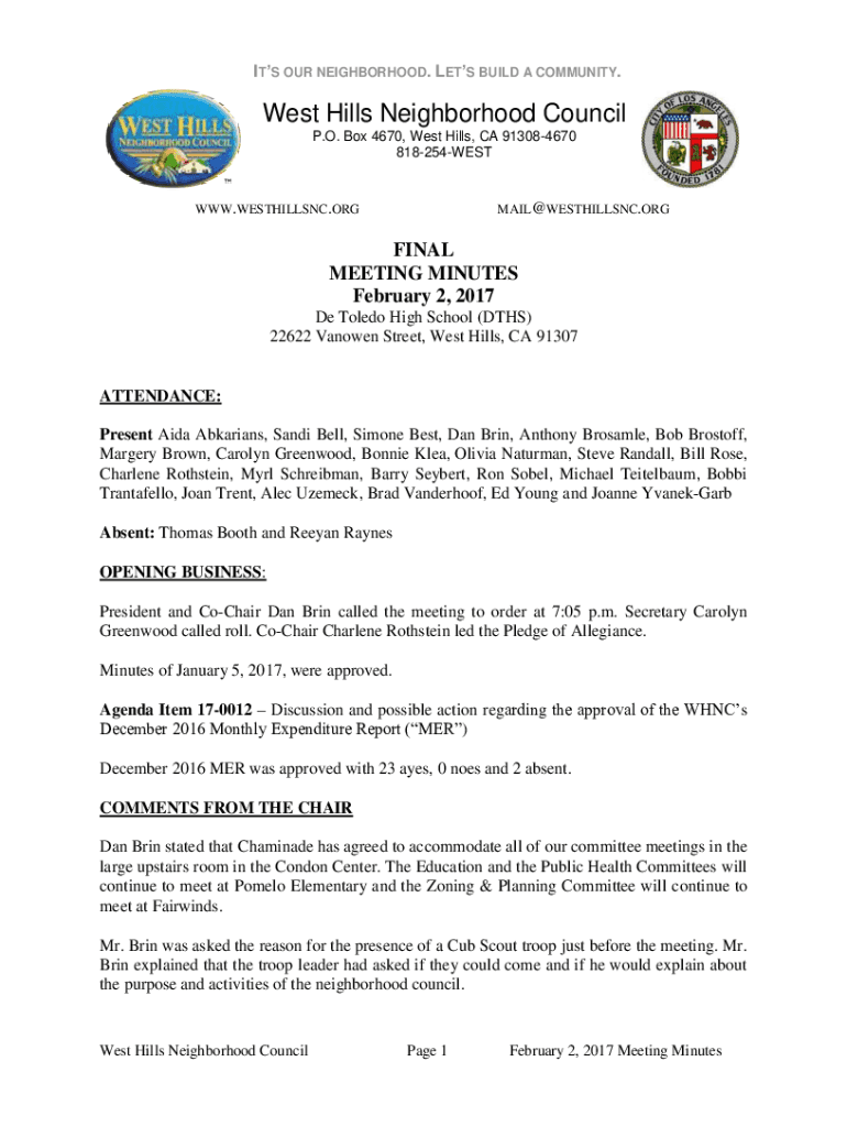 It's OUR NEIGHBORHOOD. LETS's BUILD A COMMUNITY. West Hills Neighborhood Council P.O. Box 4670, West Hills, CA 913084670 818254WESTWWW.WESTHILLSNC.ORGMAIL@WESTHILLSNC.ORGFINAL MEETING MINUTES February