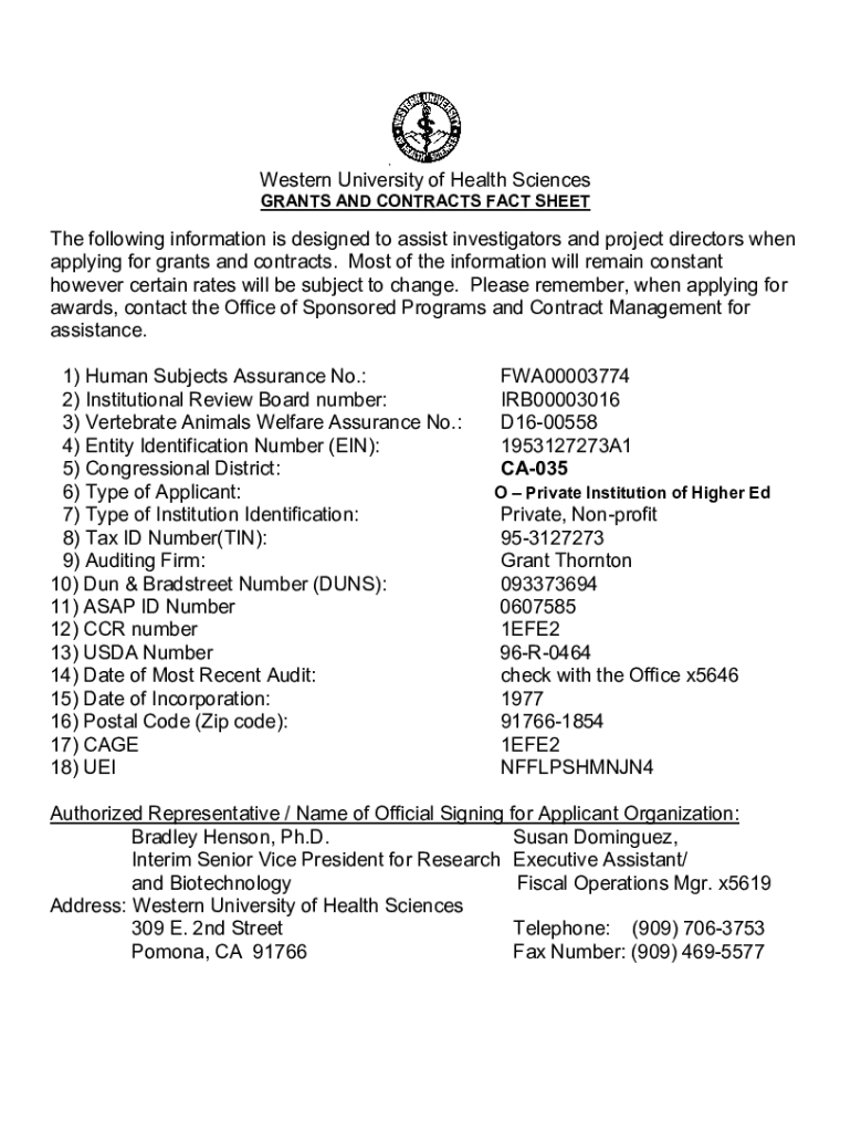 . Western University of Health Sciences GRANTS AND CONTRACTS FACT Seethe following information is designed to assist investigators and project directors when applying for grants and contracts. Most