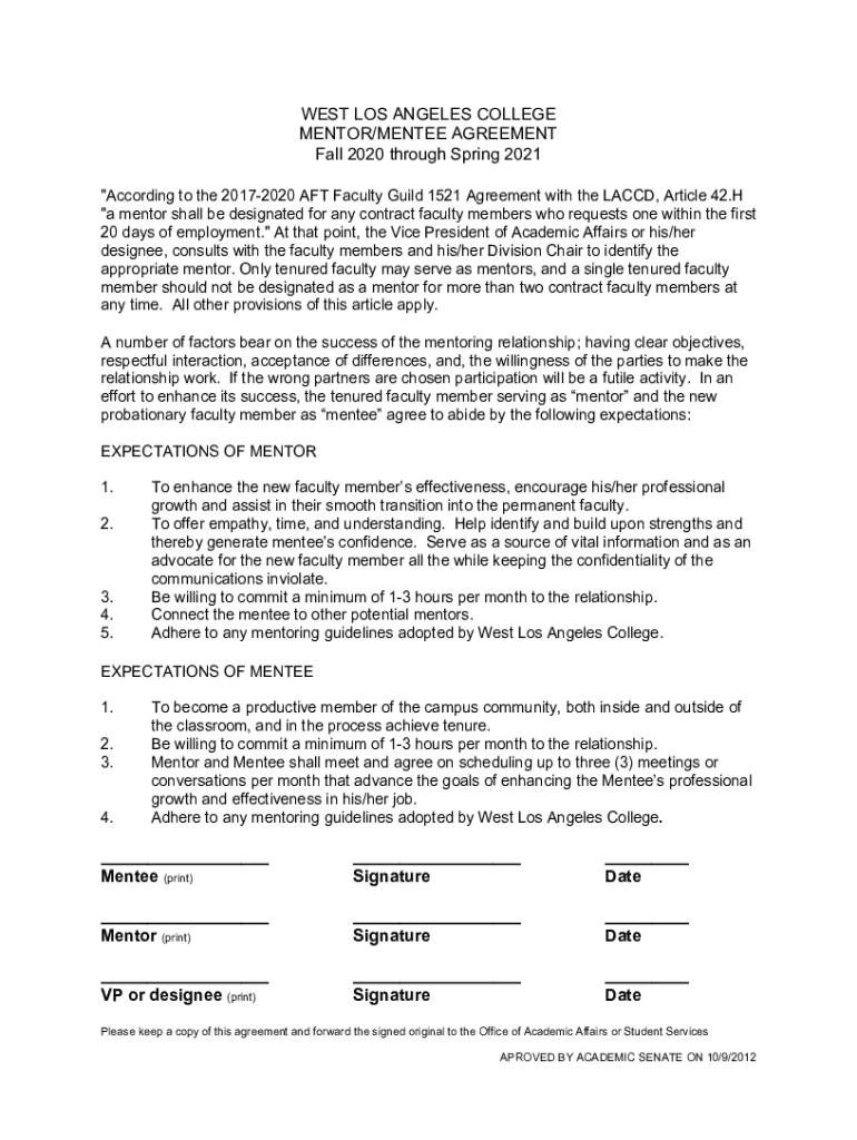 WEST LOS ANGELES COLLEGE MENTOR/MENTEE AGREEMENT Fall 2020 through Spring 2021 \” According to the 20172020 AFT Faculty Guild 1521 Agreement with the LACED, Article 42. H \” a mentor shall be
