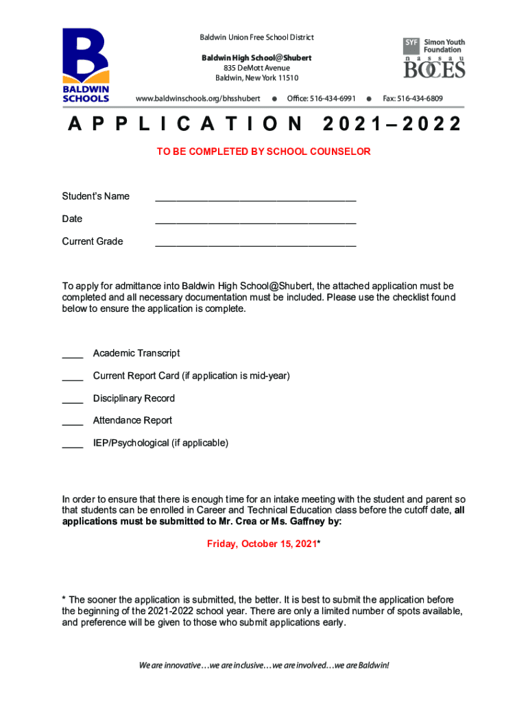 Baldwin Union Free School District Baldwin High School@Shubert 835 Demote Avenue Baldwin, New York 11510 www.baldwinschools.org/bhsshubertOffice: 5164346991A P L I C A T I ON Fax: 516434680920212022TO