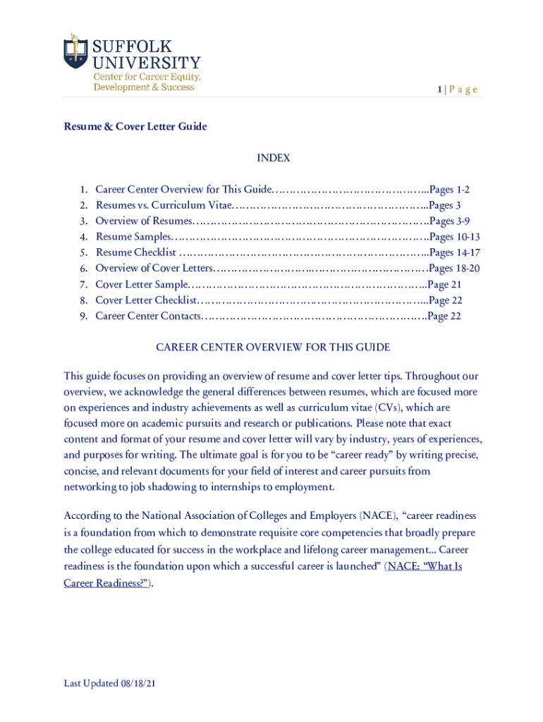 1|Presume & Cover Letter Guide INDEX 1. 2. 3. 4. 5. 6. 7. 8. 9. Career Center Overview for This Guide... Pages 12 Resumes vs. Curriculum Vitae. Pages 3 Overview of Resumes. Pages 39 Resume Samples.