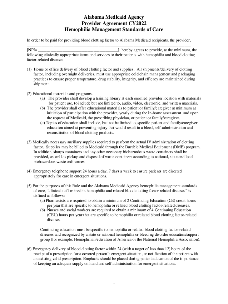 Alabama Medicaid Agency Provider Agreement CY2022 Hemophilia Management Standards of Care In order to be paid for providing blood clotting factor to Alabama Medicaid recipients, the provider, ___