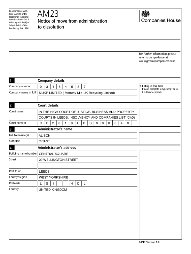 In accordance with Rule 3.61(1) of the Insolvency (England & Wales) Rules 2016 & Paragraph 84(8) of Schedule B1 of the Insolvency Act 1986.AM23Notice of move from administration to dissolution further