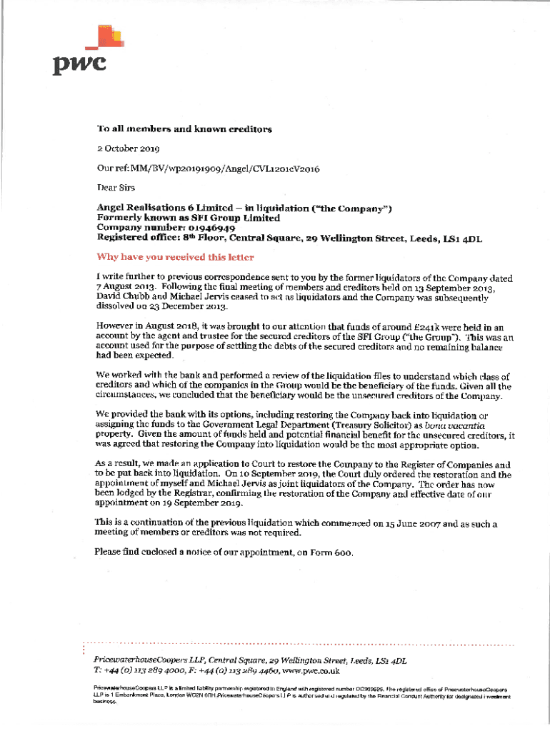 PwC To all members and known creditors 2October2019Our ref: MM/BV/wp2ol 91909/Angel/CVL1 201cV2016 Dear Sirs Angel Realizations 6 Limited in liquidation (the Company) Formerly known as Sf1 Group Limited