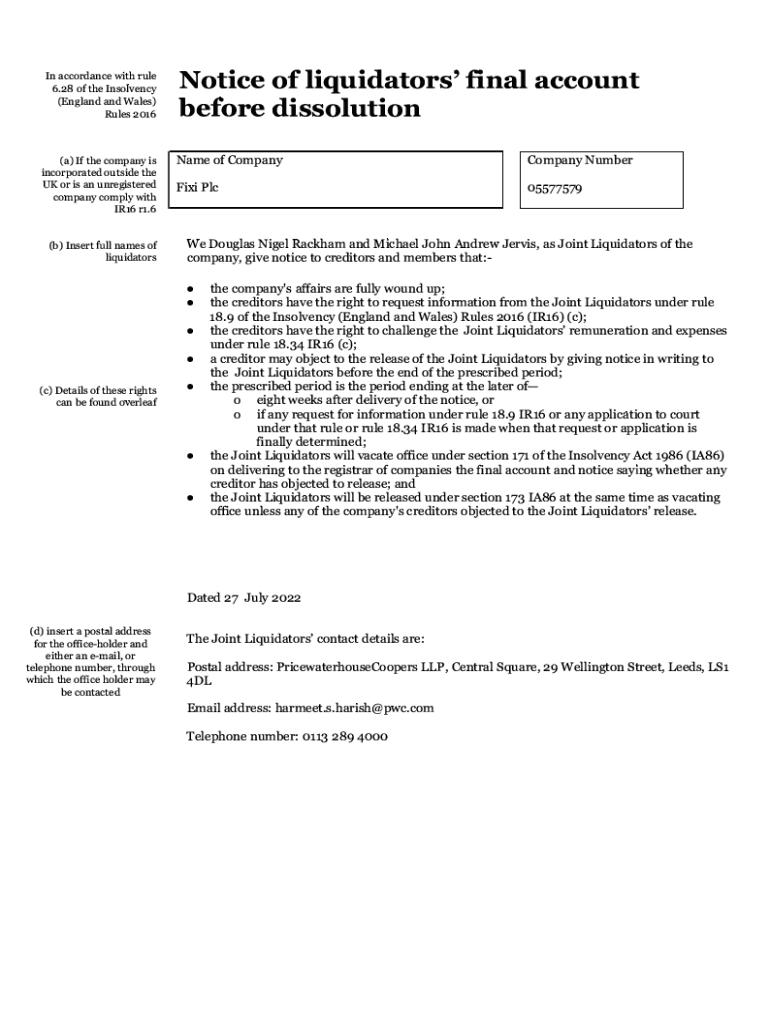 Get the free Notice of liquidators' final account before dissolution - PwC