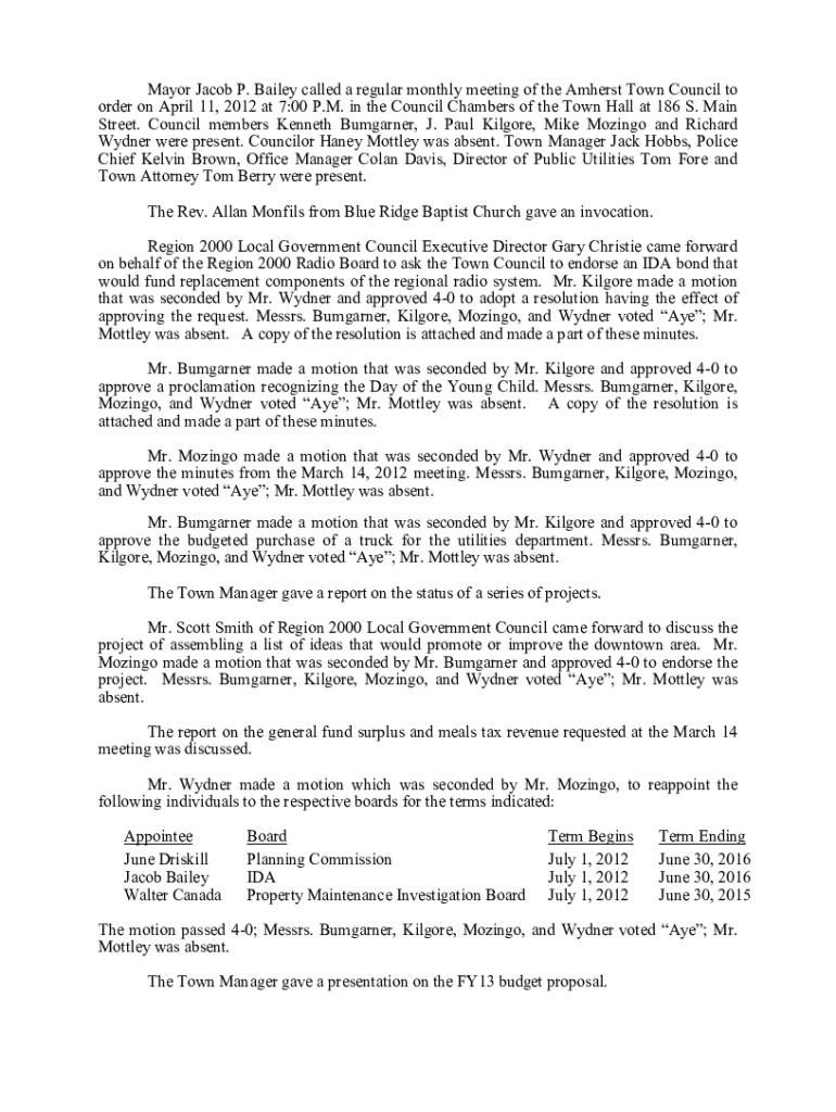 Mayor Jacob P. Bailey called a regular monthly meeting of the Amherst Town Council to order on April 11, 2012, at 7:00 P.M. in the Council Chambers of the Town Hall at 186 S. Main Street. Council