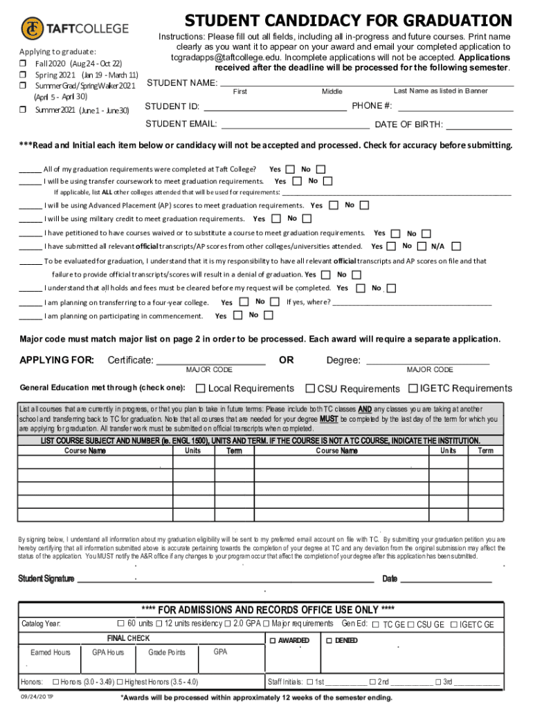 STUDENT CANDIDACY FOR GRADUATION Instructions: Please fill out all fields, including all in progress and future courses. Print name clearly as you want it to appear on your award and email your completed
