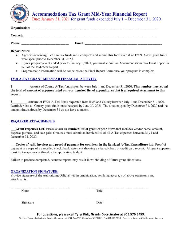 Accommodations Tax Grant Midyear Financial Report Due: January 31, 2021, for grant funds expended July 1 December 31, 2020. Organization: ___ Contact: ___ Phone: ___Email: ___Report Notes: Agencies
