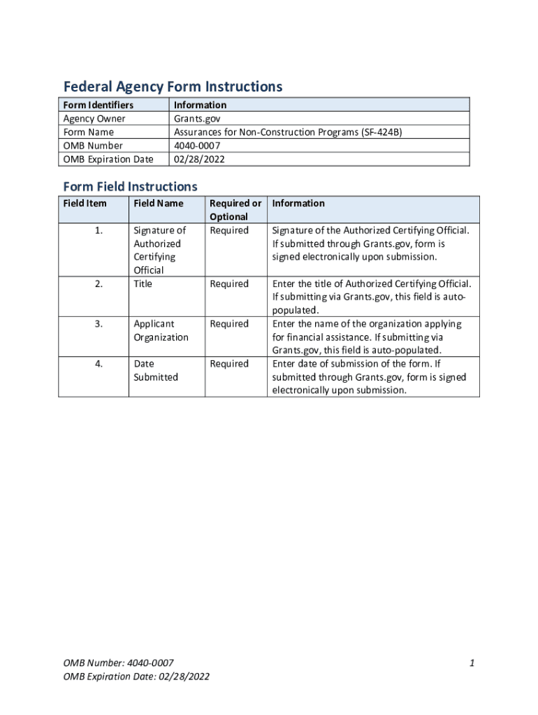 Federal Agency Form Instructions Form Identifiers Agency Owner Form Name OMB Number OMB Expiration Disinformation Grants.gov Assurances for Nonconstructive Programs (SF424B) 40400007 02/28/2022Form