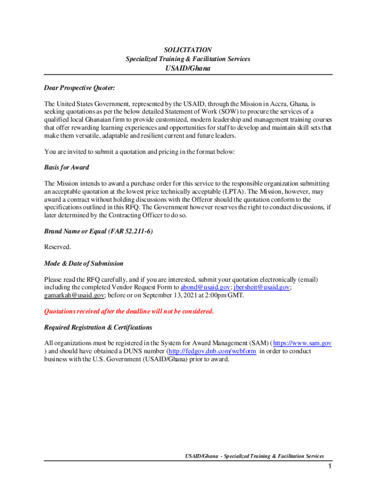 SOLICITATION Specialized Training & Facilitation ServicesUSAID/Ghana Dear Prospective Quoted: The United States Government, represented by the USAID, through the Mission in Accra, Ghana, is seeking