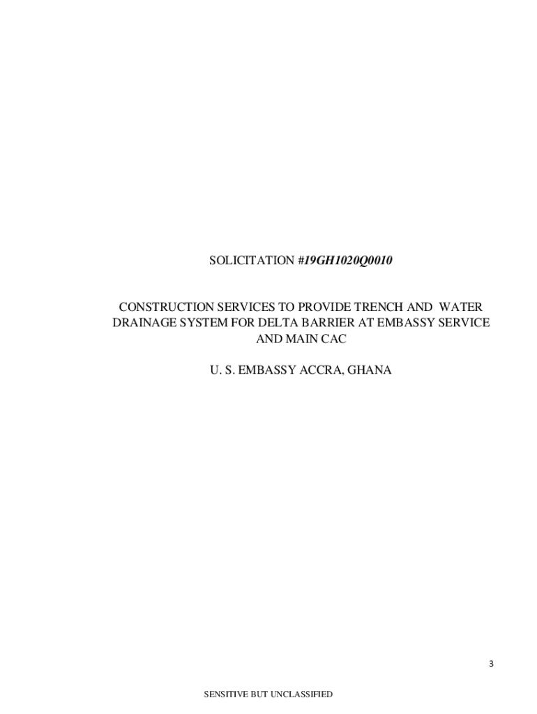 SOLICITATION #19GH1020Q0010CONSTRUCTION SERVICES TO PROVIDE TRENCH AND WATER DRAINAGE SYSTEM FOR DELTA BARRIER AT EMBASSY SERVICE AND MAIN CAC U. S. EMBASSY ACCRA, GHANA3 SENSITIVE BUT UNCLASSIFIABLE