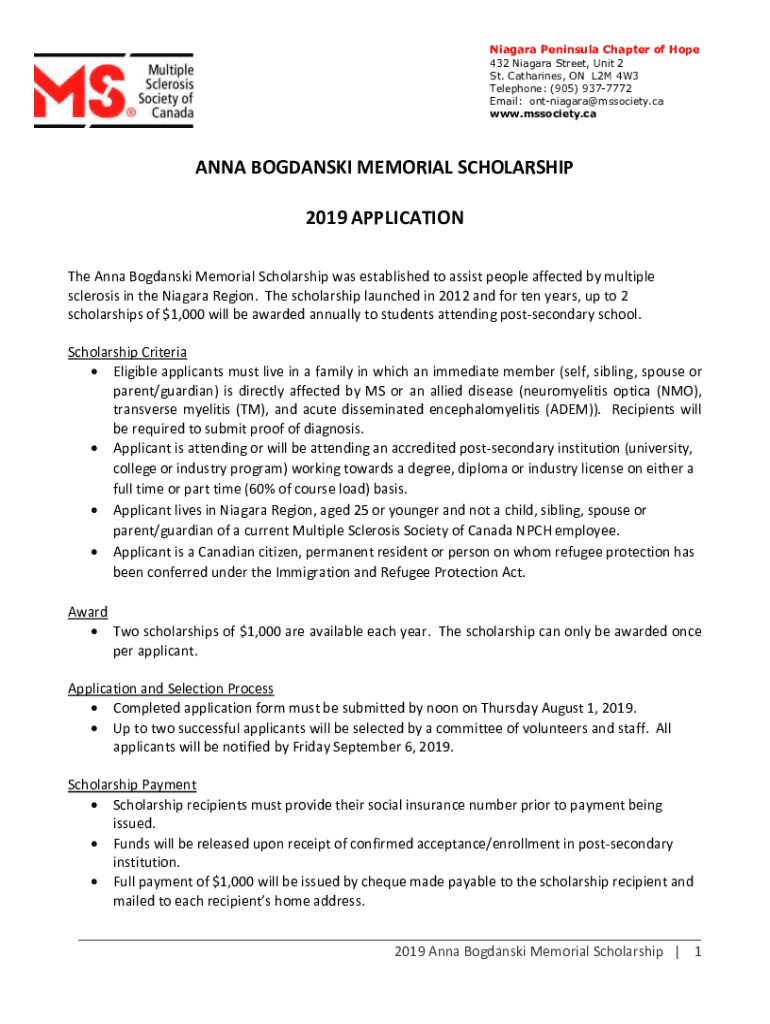 Niagara Peninsula Chapter of Hope 432 Niagara Street, Unit 2 St. Catharines, ON L2M 4W3 Telephone: (905) 9377772 Email: ontniagara@mssociety.ca www.mssociety.caANNA POLANSKI MEMORIAL SCHOLARSHIP 2019