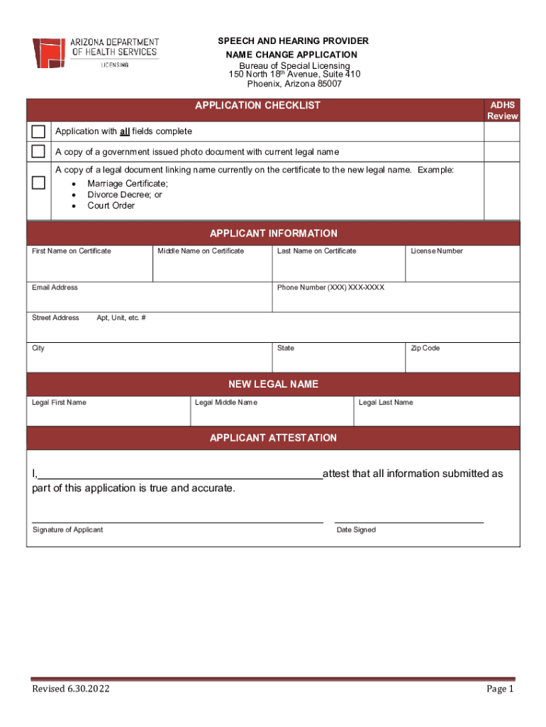 SPEECH AND HEARING PROVIDER NAME CHANGE APPLICATION Bureau of Special Licensing 150 North 18th Avenue, Suite 410 Phoenix, Arizona 85007APPLICATION CHECKLISTS ReviewApplication with all fields complete
