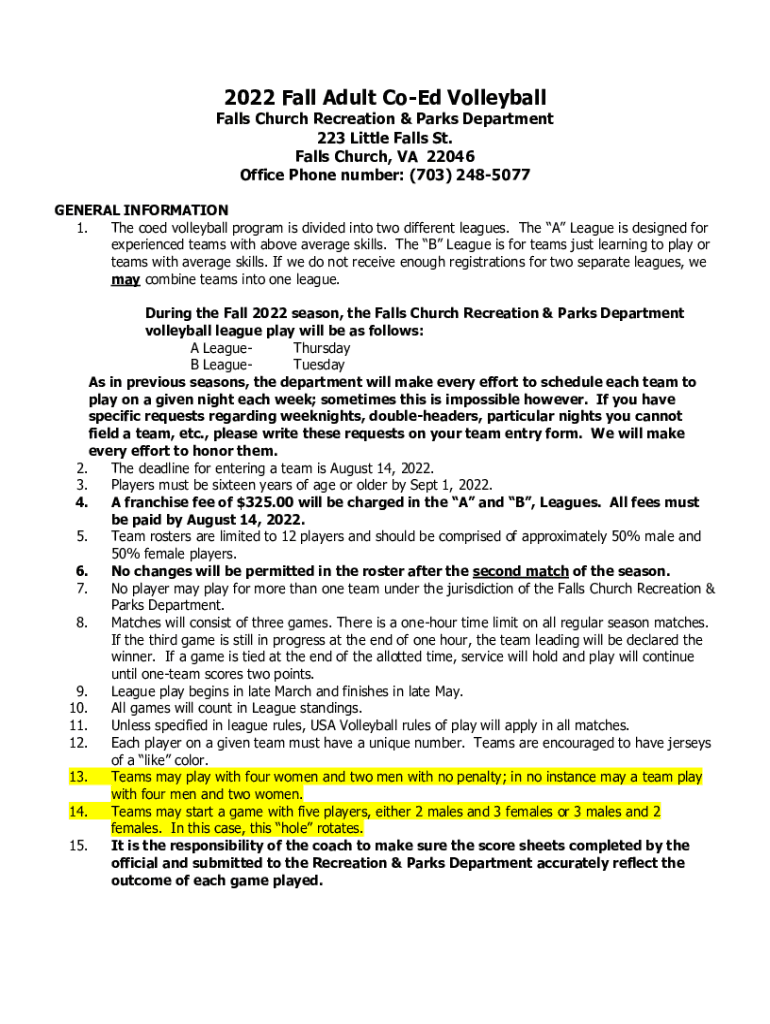 2022 Fall Adult Coed Volleyball Falls Church Recreation & Parks Department 223 Little Falls St. Falls Church, VA 22046 Office Phone number: (703) 2485077 GENERAL INFORMATION 1. The coed volleyball