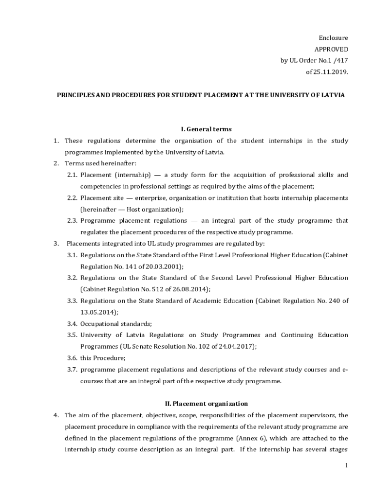 Enclosure APPROVED by UL Order No.1 /417 of 25.11.2019. PRINCIPLES AND PROCEDURES FOR STUDENT PLACEMENT AT THE UNIVERSITY OF LATVIA. General terms 1. These regulations determine the organization of