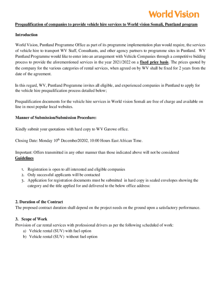 Prequalification of companies to provide vehicle hire services to World vision Somali, Punt land program Introduction World Vision, Punt land Program Office as part of its program implementation plan