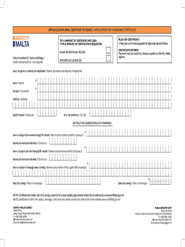 APPLIKAZZJONI GAL CERTIFICATE TA WE / APPLICATION FOR A MARRIAGE CERTIFICATEValuri market b* human métier /