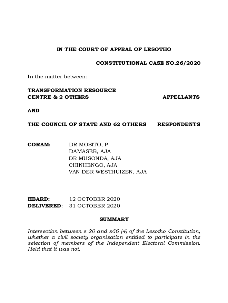 Get the free new.lesotholii.orglsjudgmentTransformation Resource Centre v The Council of State ...