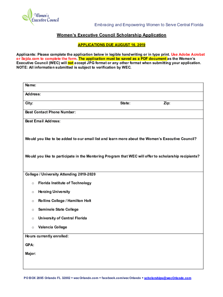 Embracing and Empowering Women to Serve Central FloridaWomens Executive Council Scholarship Application APPLICATIONS DUE AUGUST 16, 2019, Applicants: Please complete the application below in legible