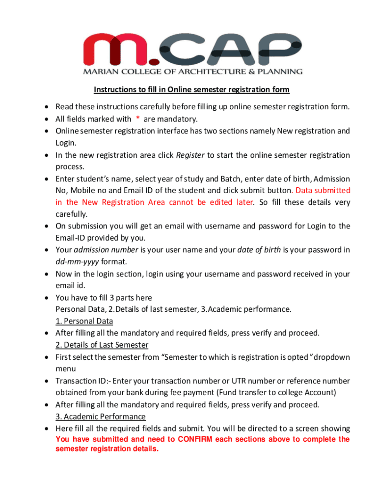 Instructions to fill in Online semester registration form Read these instructions carefully before filling up online semester registration form. All fields marked with * are mandatory. Online semester