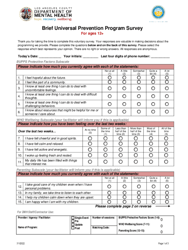 Get the free Brief Universal Prevention Program Survey - Los Angeles County, California - file la...