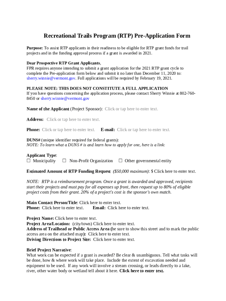 Recreational Trails Program (RTP) Pre-Application template instructions