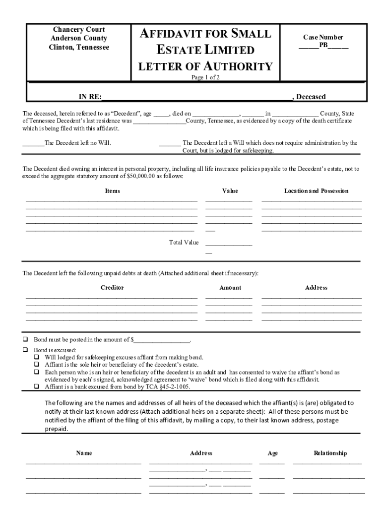 Chancery Court Anderson County Clinton, TennesseeAFFIDAVIT FOR SMALL ESTATE LIMITED LETTER OF AUTHORITY Case Number ___PB___Page 1 of 2IN RE:___, Deceased The deceased, herein referred to as Decedent,