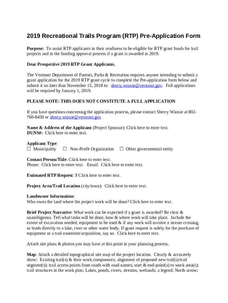 - Search for the 2019 Recreational Trails Program (RTP) Pre Application from the PDFfiller’s filebase.