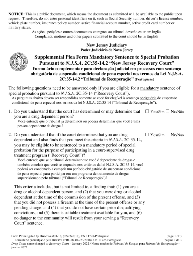 Get the free Supplemental Plea Form Mandatory Sentence to Special Probation Pursuant to N.J.S.A. ...