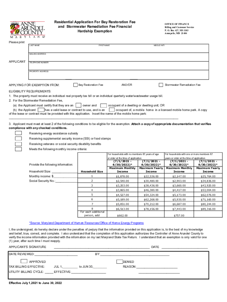 Residential Application For Bay Restoration Fee and Stormwater Remediation Fee Financial Hardship Exemption Please print NAMEOFFICE OF FINANCE Billing and Customer Service P. O. Box 427, MS 1103 Annapolis,
