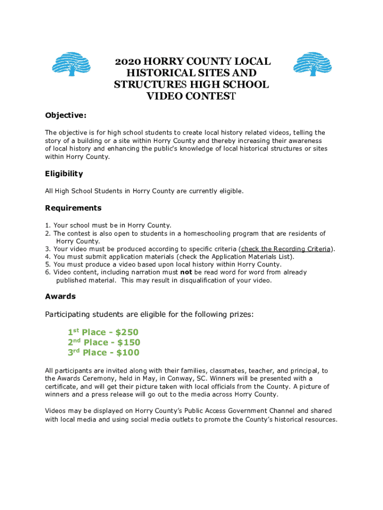 2020 HORRY COUNTY LOCAL HISTORICAL SITES AND STRUCTURES HIGH SCHOOL VIDEO CONTEST Objective: The objective is for high school students to create local history related videos, telling the story of