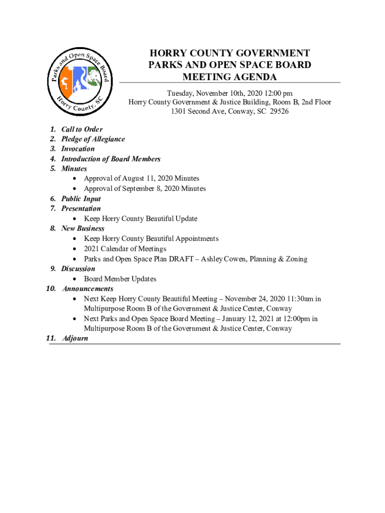 HORRY COUNTY GOVERNMENT PARKS AND OPEN SPACE BOARD MEETING AGENDA Tuesday, November 10th, 2020 12:00 pm Horry County Government & Justice Building, Room B, 2nd Floor 1301 Second Ave, Conway, SC 29526