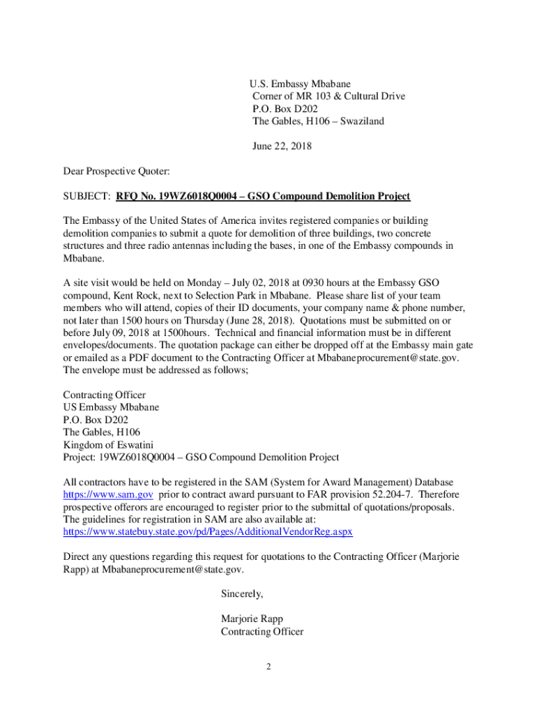 U.S. Embassy Mbabane Corner of MR 103 & Cultural Drive P.O. Box D202 The Gables, H106 Swaziland June 22, 2018, Dear Prospective Quoted: SUBJECT: RFQ No. 19WZ6018Q0004 GSO Compound Demolition Project