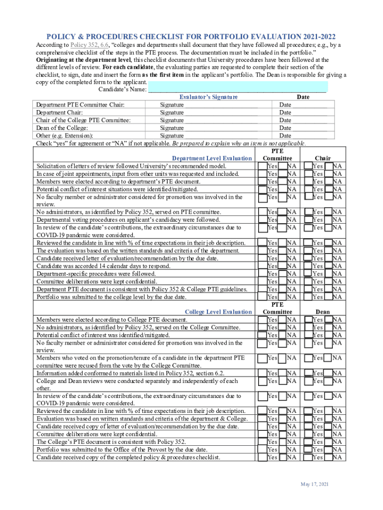 POLICY & PROCEDURES CHECKLIST FOR PORTFOLIO EVALUATION 20212022According to Policy 352, 6.6, colleges and departments shall document that they have followed all procedures; e.g., by a comprehensive