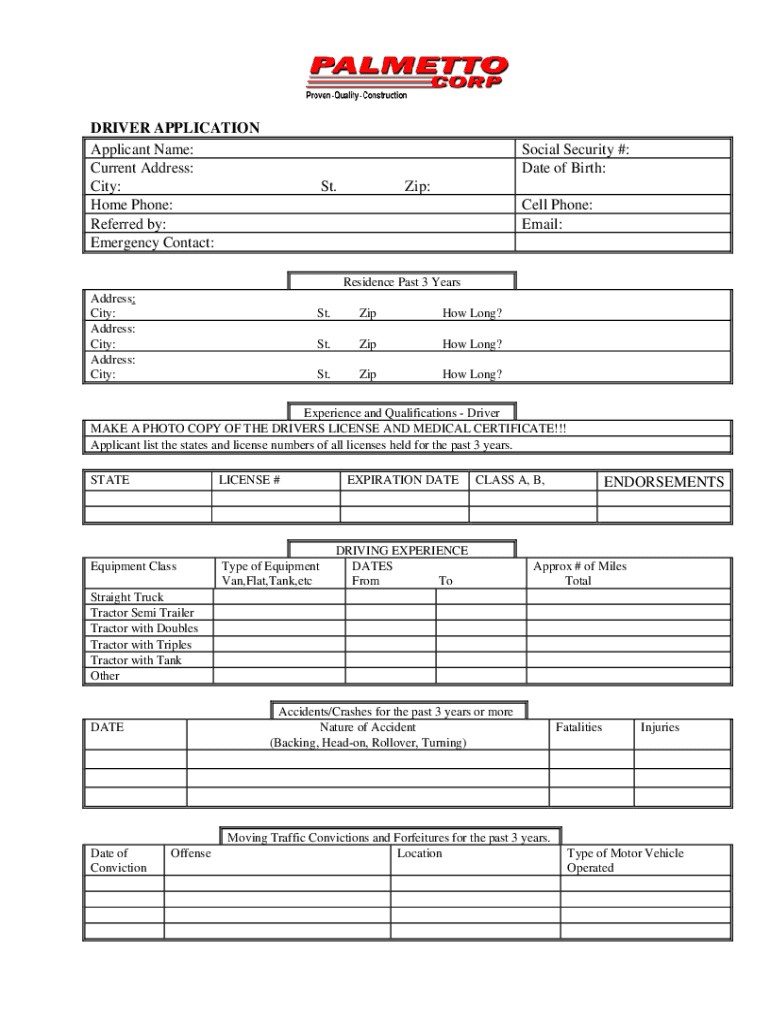 DRIVER APPLICATION Applicant Name: Current Address: City: Home Phone: Referred by: Emergency Contact:Social Security #: Date of Birth: St. Zip: Cell Phone: Email:Residence Past 3 Years Address: City: