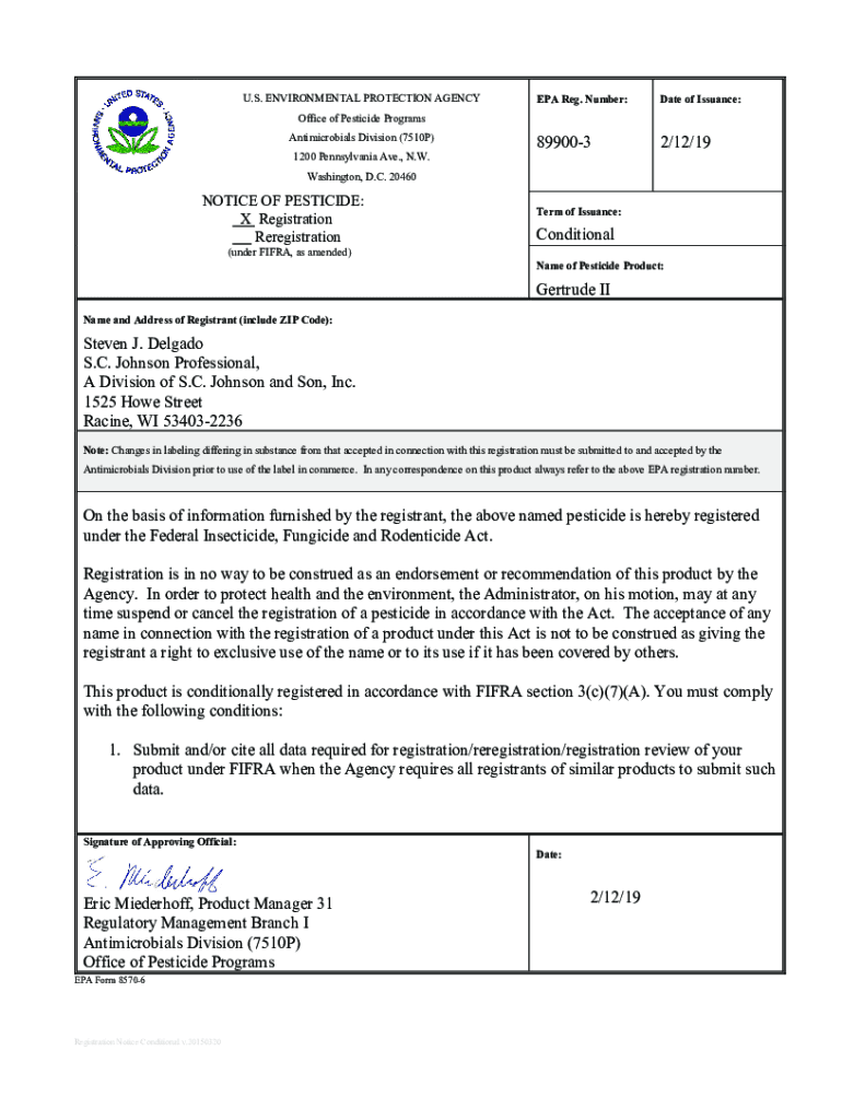 U.S. ENVIRONMENTAL PROTECTION AGENCY EPA Reg. Number:Date of Issuance:8990032/12/19Office of Pesticide Programs Antimicrobial Division (7510P) 1200 Pennsylvania Ave., N.W. Washington, D.C. 20460NOTICE
