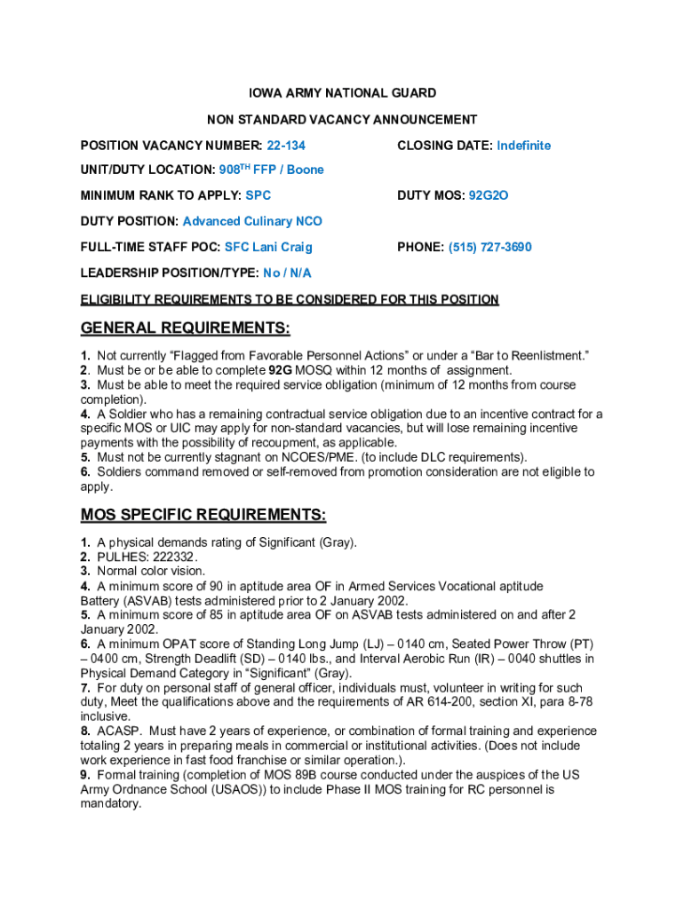 IOWA ARMY NATIONAL GUARD NON-STANDARD VACANCY ANNOUNCEMENT POSITION VACANCY NUMBER: 22134CLOSING DATE: Indefinite UNIT/DUTY LOCATION: 908TH FFP / Boone MINIMUM RANK TO APPLY: SOCIETY MOS: 92G2ODUTY