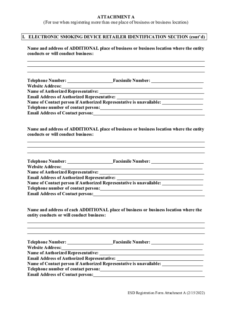 ATTACHMENT A (For use when registering more than one place of business or business location) I. ELECTRONIC SMOKING DEVICE RETAILER IDENTIFICATION SECTION (contd) Name and address of ADDITIONAL place